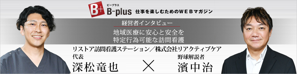 リストア訪問看護ステーション/株式会社リアクティブケアが、野球解説者濱中治さんに経営者インタビューをしていただきました。その時の様子が「B-plus 仕事を楽しむためのWEBマガジン」に掲載されています。